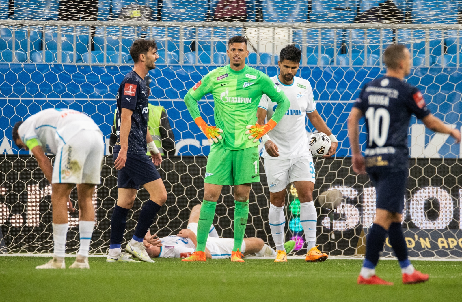 14.09.2022. Россия, Самара, «Солидарность Самара Арена». ФОНБЕТ Кубок России, 2022/23, Группа B, 2-й тур, «Крылья советов» — «Зенит». На снимке: Иван Куарезма, вратарь ФК «Зенит» и Дмитрий Чистяков, защитник ФК «Зенит».Автор: Вячеслав Евдокимов / ФК «Зенит»