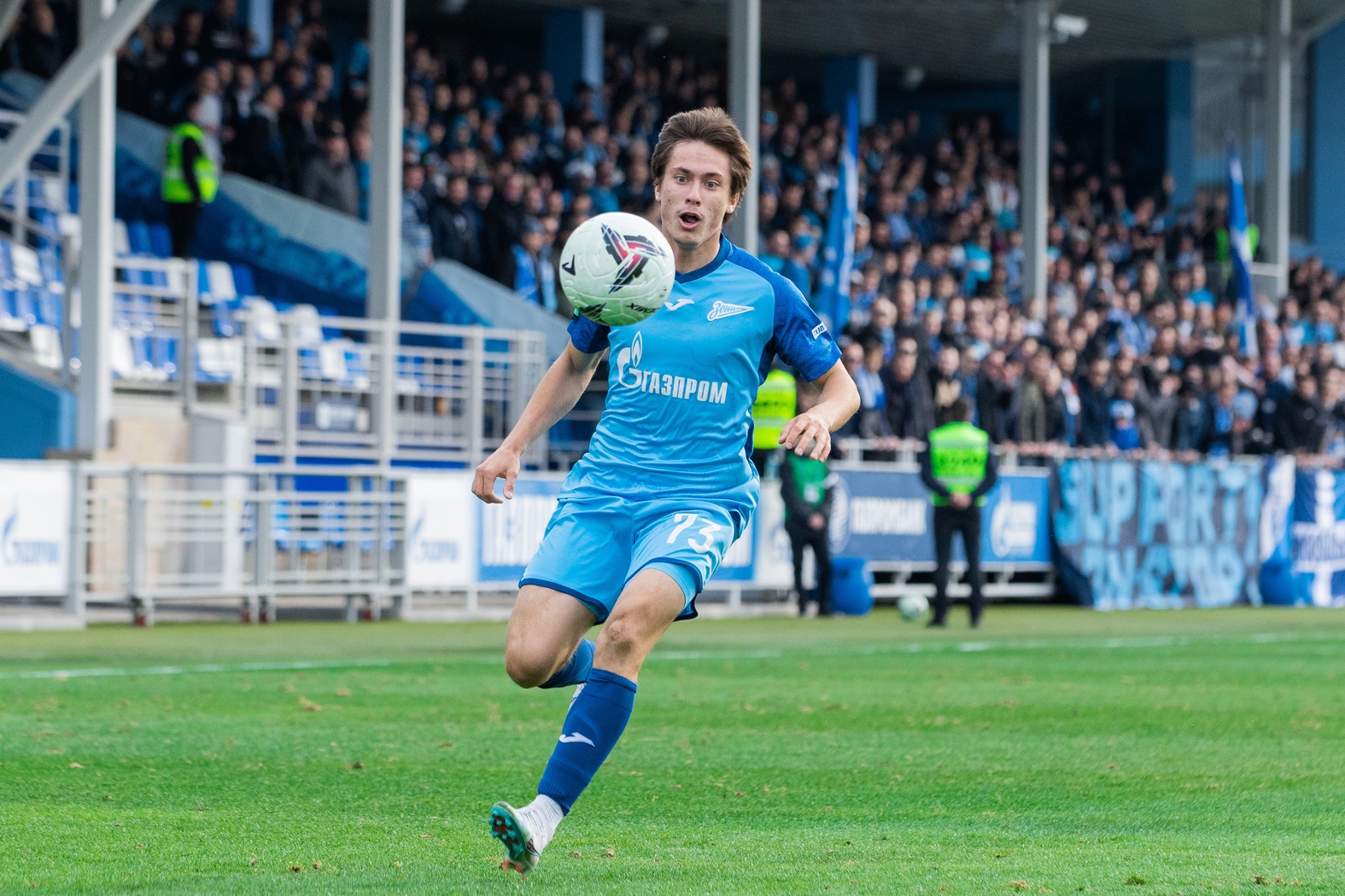 16.04.2023. Россия, Санкт-Петербург, «Газпром»-Академия ФК «Зенит». Вторая лига 2022/23, 3-й тур, «Зенит»-2 — «Динамо»-2. На снимке в синей форме: Владислав Саусь, полузащитник ФК «Зенит».Автор: Анна Мейер / ФК «Зенит»