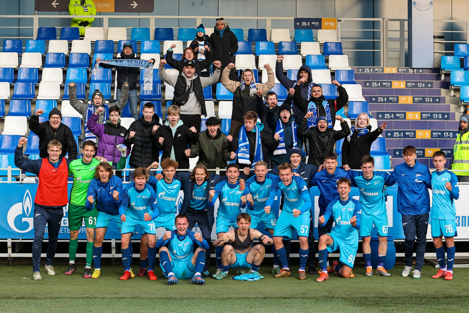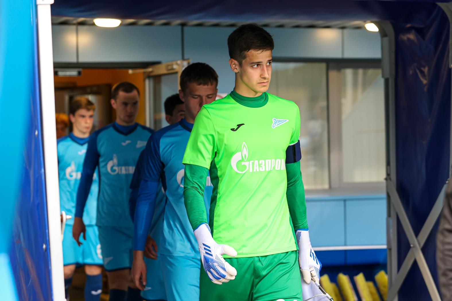 05.05.2023. Россия, Санкт-Петербург, «Смена». МФЛ 2022/23, 26-й тур, «Зенит» — «Динамо». На снимке: Владимир Павлов, вратарь ФК «Зенит», Богдан Москвичев, вратарь ФК «Зенит», Аким Белохонов, нападающий ФК «Зенит», Никита Вершинин, полузащитник ФК «Зенит», Максим Шаров, защитник ФК «Зенит», Евгений Пшенников, нападающий ФК «Зенит», Виталий Французов, защитник ФК «Зенит», Игорь Козлов, нападающий ФК «Зенит», Никита Лобов, защитник ФК «Зенит», Никита Лузан, нападающий ФК «Зенит», Матвей Бардачев, защитник ФК «Зенит», Дмитрий Самарцев, нападающий ФК «Зенит», Даниил Столяров, полузащитник ФК «Зенит», Алексей Барановский, нападающий ФК «Зенит», Рони Михайловский, нападающий ФК «Зенит», Евгений Тоневицкий, защитник ФК «Зенит», Илья Родионов, нападающий ФК «Зенит».Автор: Алена Яшина / ФК «Зенит»