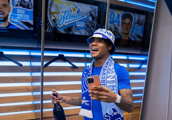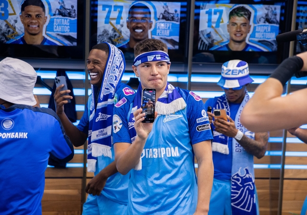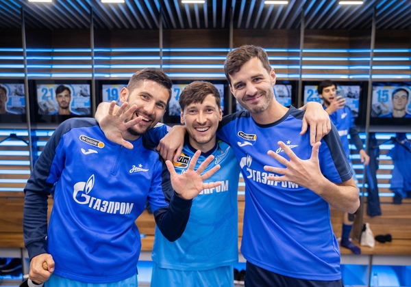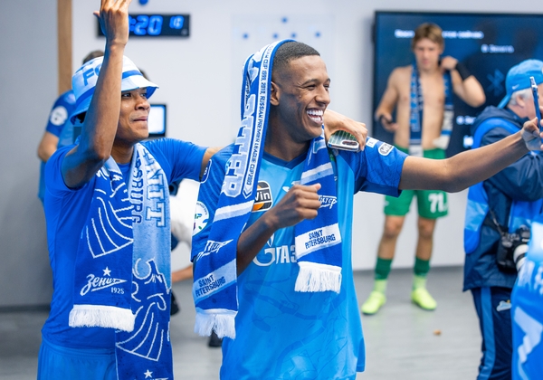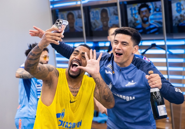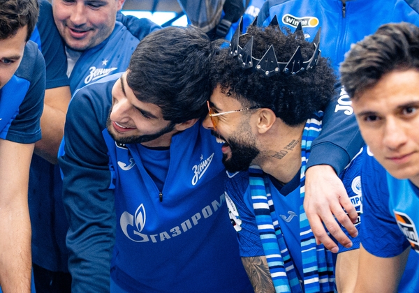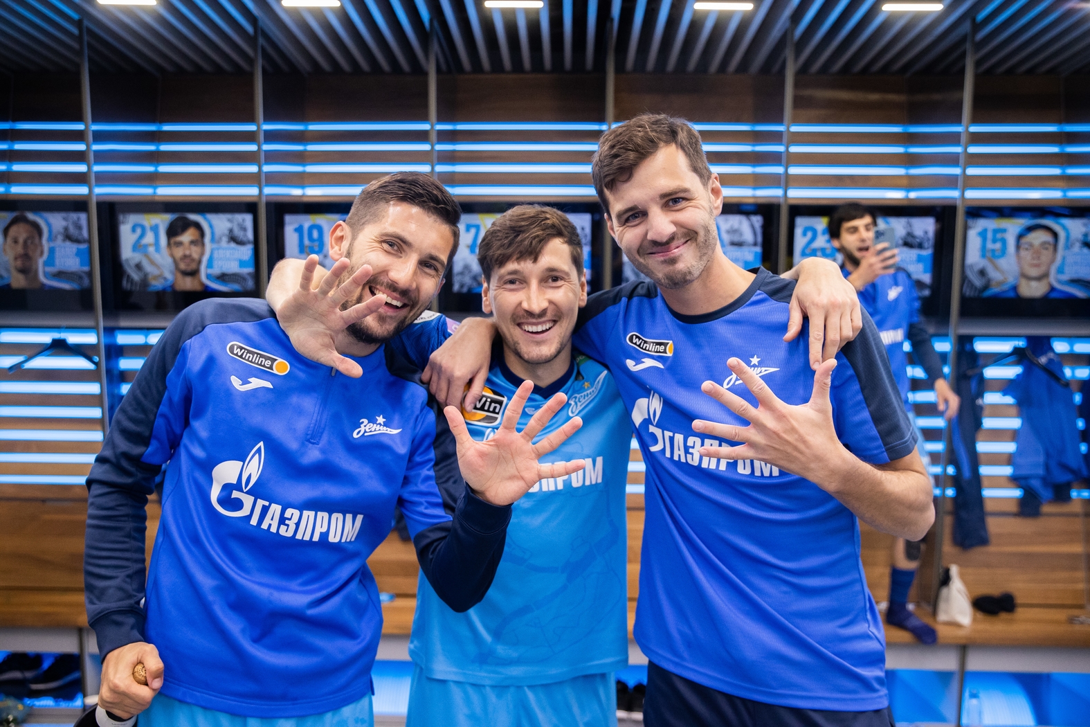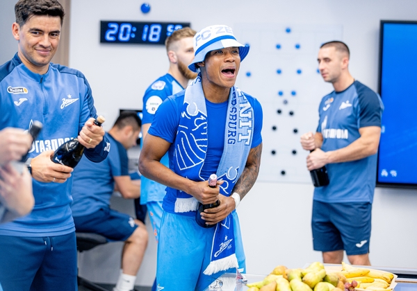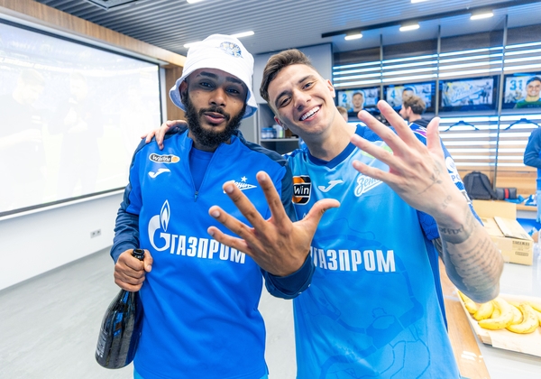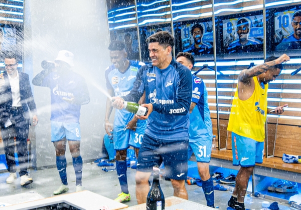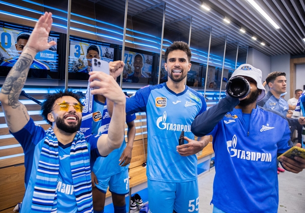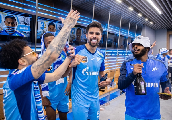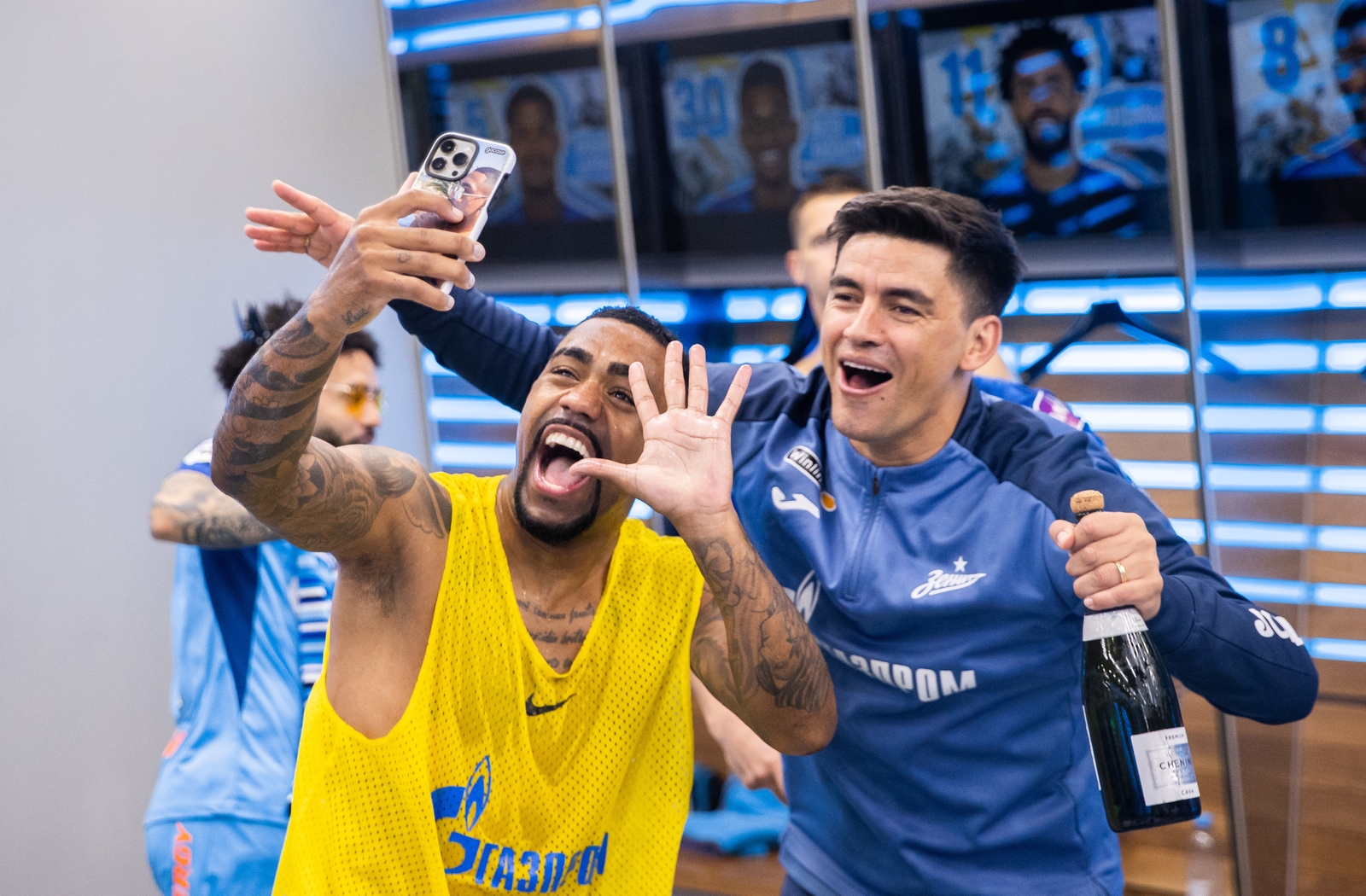 07.05.2023. Россия, Санкт-Петербург, «Газпром Арена». Команда в раздевалке празднует победу в Чемпионате России после матча Мир Российская Премьер-Лига 2022/23, 26-й тур, «Зенит» — «Спартак». На снимке: Родригао, защитник ФК «Зенит», Вильмар Барриос, полузащитник ФК «Зенит», Андрей Мостовой, полузащитник ФК «Зенит», Даниил Одоевский, вратарь ФК «Зенит», Вильям де Оливейра, тренер ФК «Зенит».Автор: Вячеслав Евдокимов / ФК «Зенит»