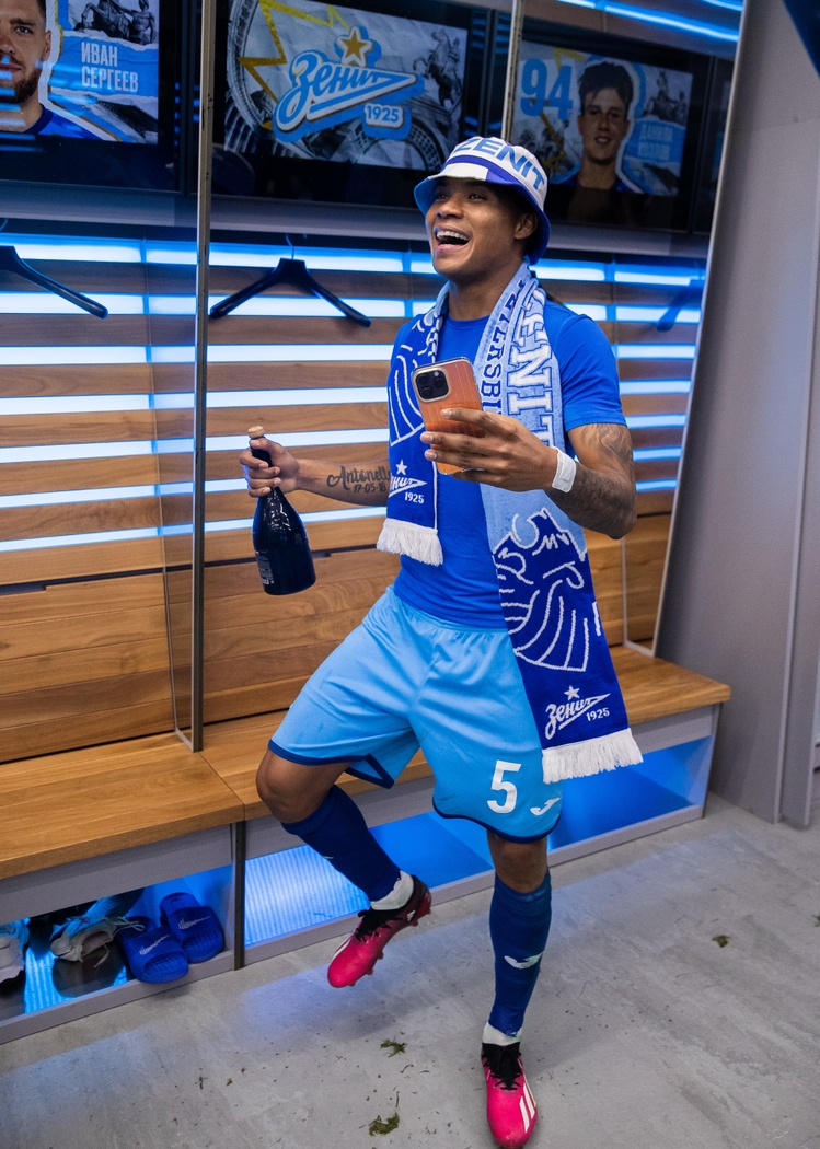 07.05.2023. Россия, Санкт-Петербург, «Газпром Арена». Команда в раздевалке празднует победу в Чемпионате России после матча Мир Российская Премьер-Лига 2022/23, 26-й тур, «Зенит» — «Спартак». На снимке: Вендел, полузащитник ФК «Зенит».Автор: Анна Мейер / ФК «Зенит»