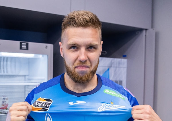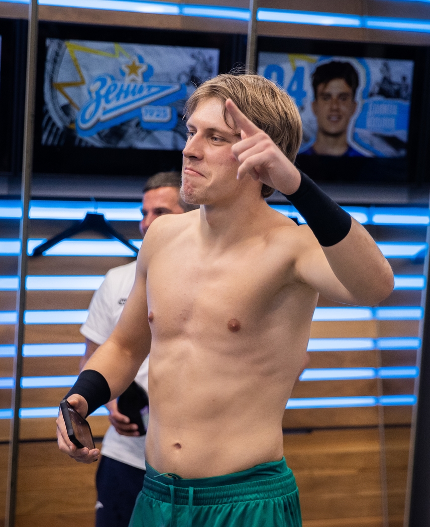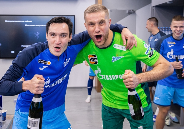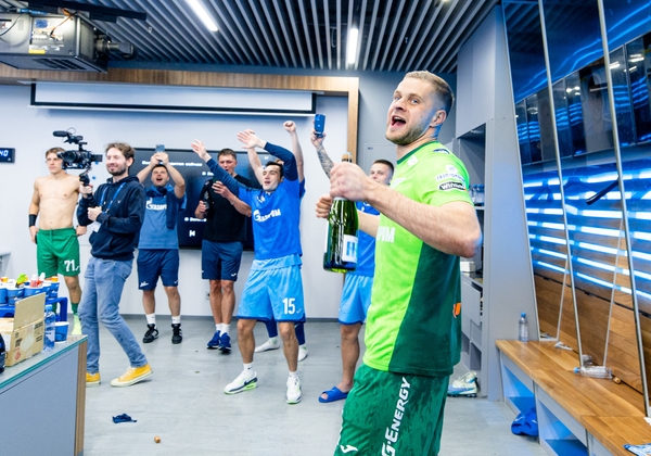 07.05.2023. Россия, Санкт-Петербург, «Газпром Арена». Команда в раздевалке празднует победу в Чемпионате России после матча Мир Российская Премьер-Лига 2022/23, 26-й тур, «Зенит» — «Спартак». На снимке: Александр Васютин, вратарь ФК «Зенит».Автор: Анна Мейер / ФК «Зенит»