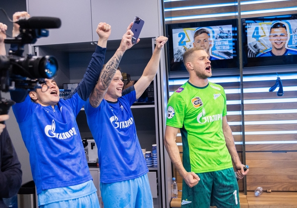 07.05.2023. Россия, Санкт-Петербург, «Газпром Арена». Команда в раздевалке празднует победу в Чемпионате России после матча Мир Российская Премьер-Лига 2022/23, 26-й тур, «Зенит» — «Спартак». На снимке: Вячеслав Караваев, защитник ФК «Зенит», Данил Круговой, защитник ФК «Зенит», Александр Васютин, вратарь ФК «Зенит».Автор: Вячеслав Евдокимов / ФК «Зенит»