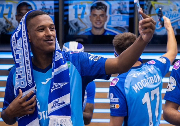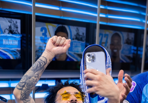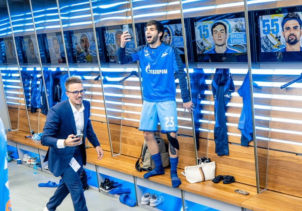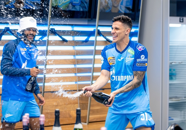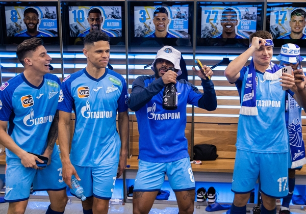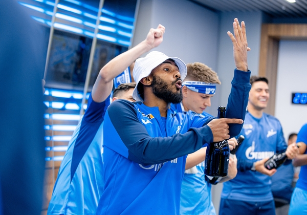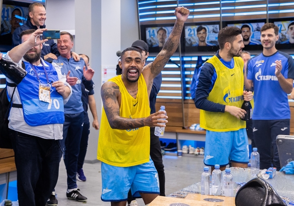 07.05.2023. Россия, Санкт-Петербург, «Газпром Арена». Команда в раздевалке празднует победу в Чемпионате России после матча Мир Российская Премьер-Лига 2022/23, 26-й тур, «Зенит» — «Спартак». На снимке: Малком, полузащитник ФК «Зенит».Автор: Вячеслав Евдокимов / ФК «Зенит»