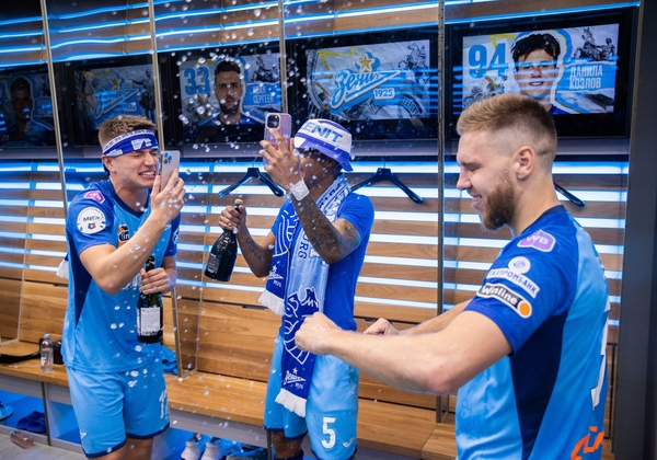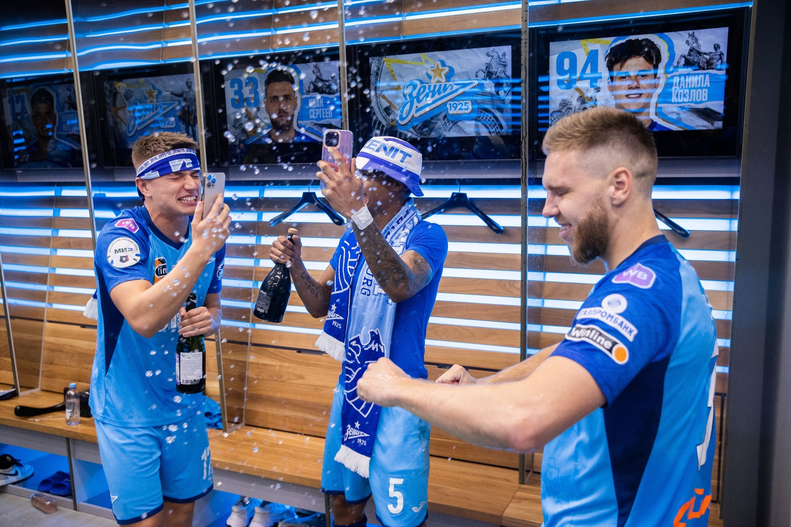 07.05.2023. Россия, Санкт-Петербург, «Газпром Арена». Команда в раздевалке празднует победу в Чемпионате России после матча Мир Российская Премьер-Лига 2022/23, 26-й тур, «Зенит» — «Спартак». На снимке: Андрей Мостовой, полузащитник ФК «Зенит», Вильмар Барриос, полузащитник ФК «Зенит», Иван Сергеев, нападающий ФК «Зенит».Автор: Вячеслав Евдокимов / ФК «Зенит»