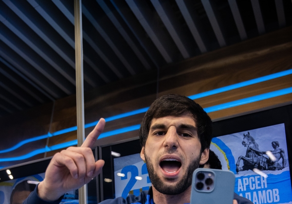 07.05.2023. Россия, Санкт-Петербург, «Газпром Арена». Команда в раздевалке празднует победу в Чемпионате России после матча Мир Российская Премьер-Лига 2022/23, 26-й тур, «Зенит» — «Спартак». На снимке: Арсен Адамов, защитник ФК «Зенит».Автор: Вячеслав Евдокимов / ФК «Зенит»