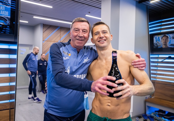 07.05.2023. Россия, Санкт-Петербург, «Газпром Арена». Команда в раздевалке празднует победу в Чемпионате России после матча Мир Российская Премьер-Лига 2022/23, 26-й тур, «Зенит» — «Спартак». На снимке: Малком, полузащитник ФК «Зенит», Вильям де Оливейра, тренер ФК «Зенит».Автор: Вячеслав Евдокимов / ФК «Зенит»