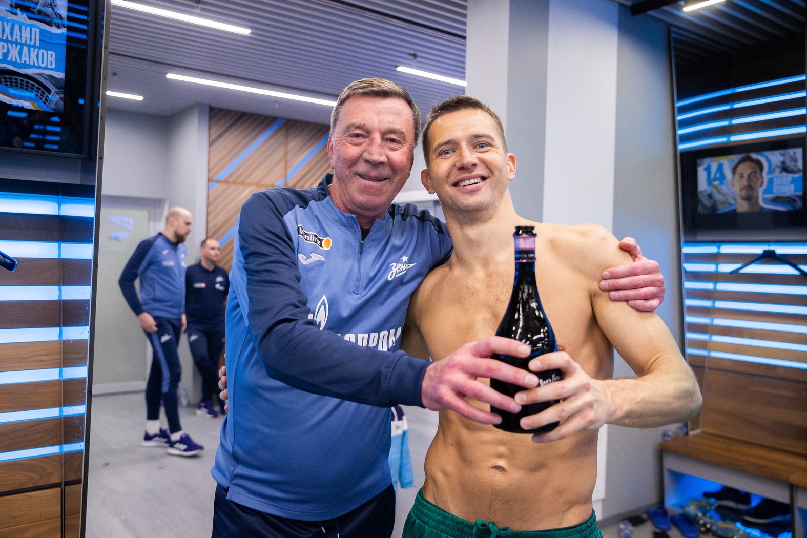 07.05.2023. Россия, Санкт-Петербург, «Газпром Арена». Команда в раздевалке празднует победу в Чемпионате России после матча Мир Российская Премьер-Лига 2022/23, 26-й тур, «Зенит» — «Спартак». На снимке: Михаил Бирюков, тренер вратарей ФК «Зенит», Михаил Кержаков, вратарь ФК «Зенит».Автор: Вячеслав Евдокимов / ФК «Зенит»