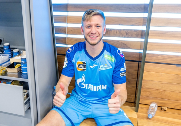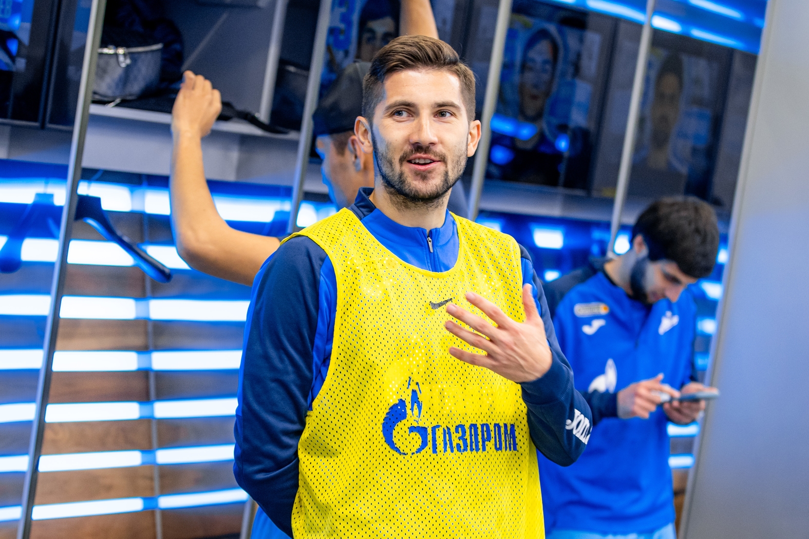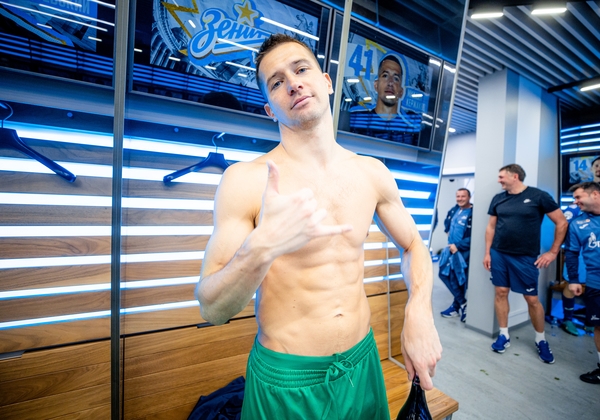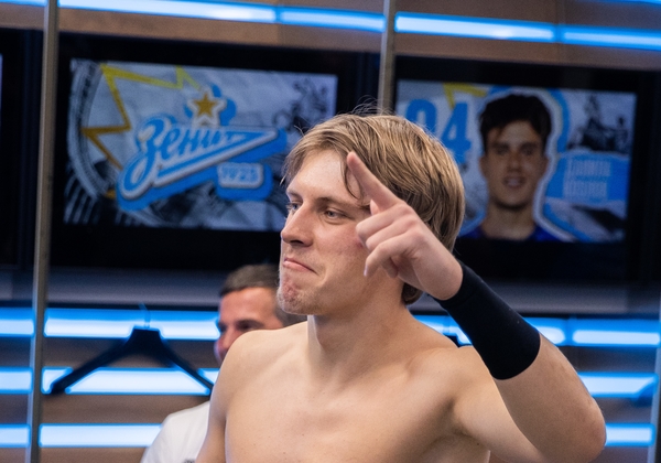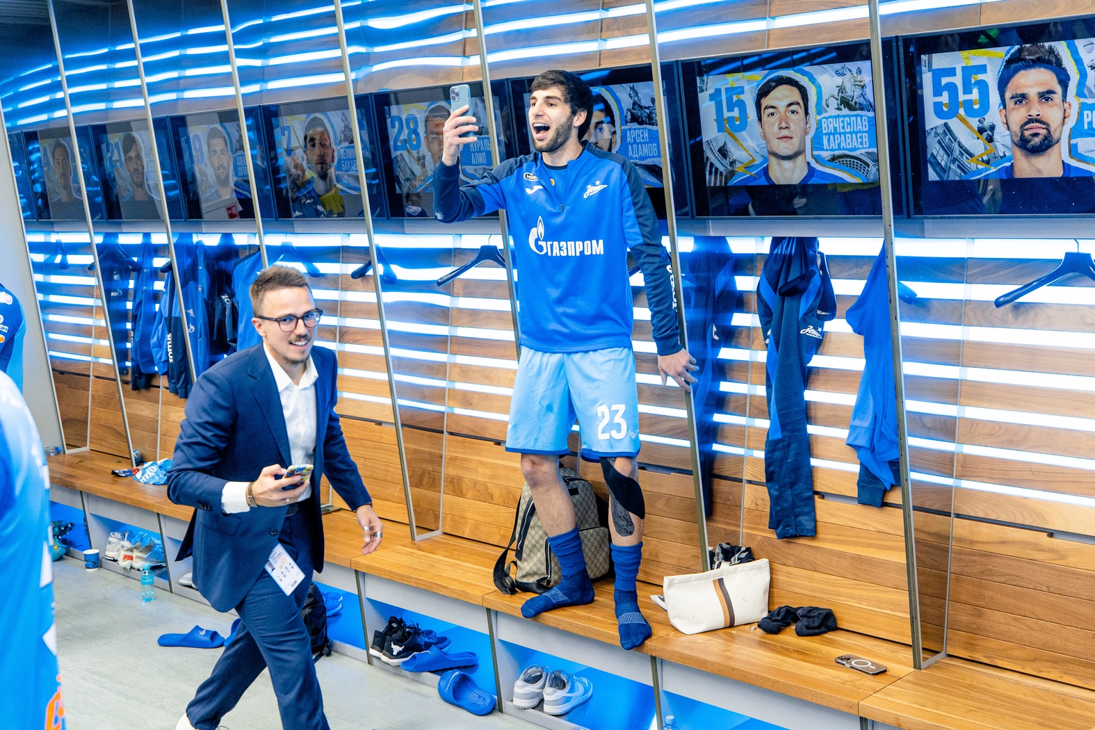 07.05.2023. Россия, Санкт-Петербург, «Газпром Арена». Команда в раздевалке празднует победу в Чемпионате России после матча Мир Российская Премьер-Лига 2022/23, 26-й тур, «Зенит» — «Спартак». На снимке: Алексей Сутормин, полузащитник ФК «Зенит».Автор: Анна Мейер / ФК «Зенит»
