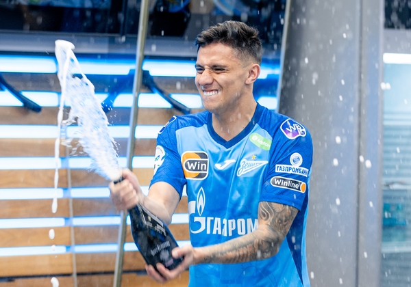 07.05.2023. Россия, Санкт-Петербург, «Газпром Арена». Команда в раздевалке празднует победу в Чемпионате России после матча Мир Российская Премьер-Лига 2022/23, 26-й тур, «Зенит» — «Спартак». На снимке: Вильмар Барриос, полузащитник ФК «Зенит».Автор: Вячеслав Евдокимов / ФК «Зенит»
