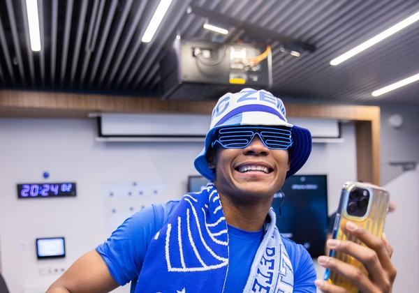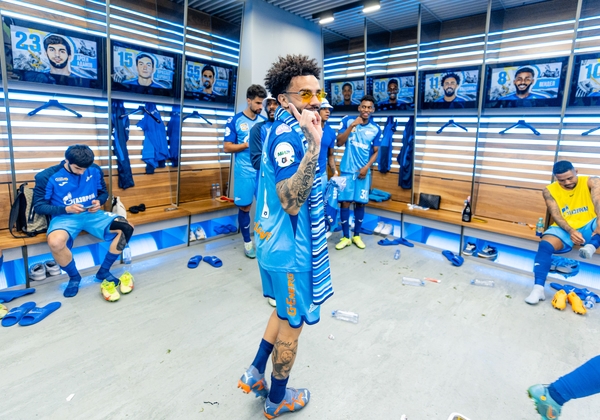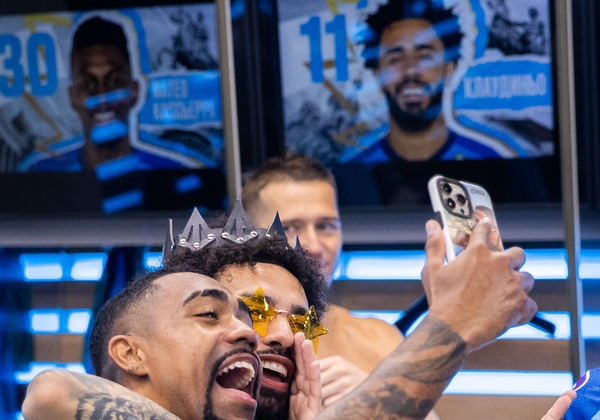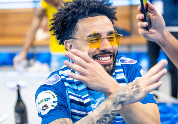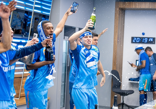 07.05.2023. Россия, Санкт-Петербург, «Газпром Арена». Команда в раздевалке празднует победу в Чемпионате России после матча Мир Российская Премьер-Лига 2022/23, 26-й тур, «Зенит» — «Спартак». На снимке: Клаудиньо, полузащитник ФК «Зенит».Автор: Анна Мейер / ФК «Зенит»