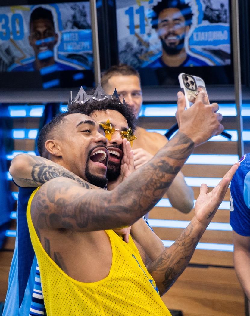07.05.2023. Россия, Санкт-Петербург, «Газпром Арена». Команда в раздевалке празднует победу в Чемпионате России после матча Мир Российская Премьер-Лига 2022/23, 26-й тур, «Зенит» — «Спартак». На снимке: Арсен Адамов, защитник ФК «Зенит», Клаудиньо, полузащитник ФК «Зенит».Автор: Анна Мейер / ФК «Зенит»