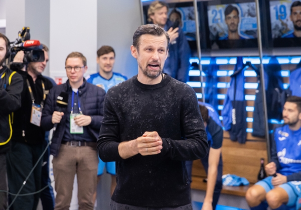 07.05.2023. Россия, Санкт-Петербург, «Газпром Арена». Команда в раздевалке празднует победу в Чемпионате России после матча Мир Российская Премьер-Лига 2022/23, 26-й тур, «Зенит» — «Спартак». На снимке: Сергей Семак, главный тренер ФК «Зенит».Автор: Анна Мейер / ФК «Зенит»