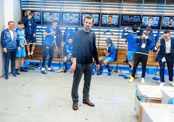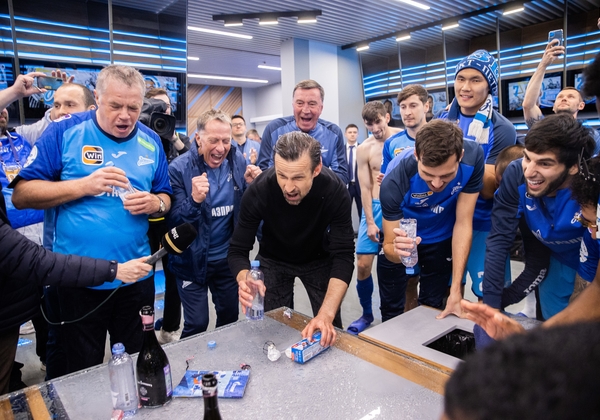 07.05.2023. Россия, Санкт-Петербург, «Газпром Арена». Команда в раздевалке празднует победу в Чемпионате России после матча Мир Российская Премьер-Лига 2022/23, 26-й тур, «Зенит» — «Спартак». На снимке: Александр Низелик, тренер ФК «Зенит».Автор: Анна Мейер / ФК «Зенит»