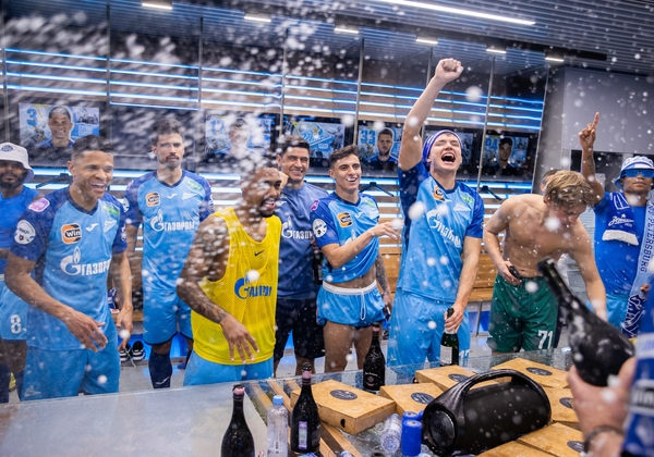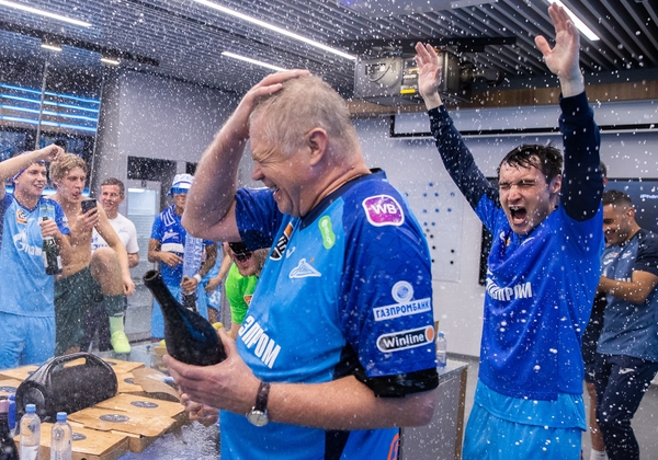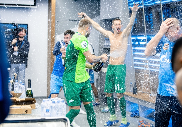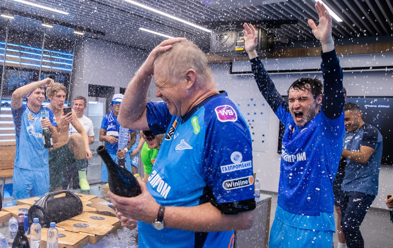 07.05.2023. Россия, Санкт-Петербург, «Газпром Арена». Команда в раздевалке празднует победу в Чемпионате России после матча Мир Российская Премьер-Лига 2022/23, 26-й тур, «Зенит» — «Спартак».Автор: Вячеслав Евдокимов / ФК «Зенит»