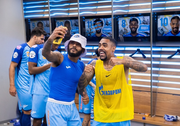 07.05.2023. Россия, Санкт-Петербург, «Газпром Арена». Команда в раздевалке празднует победу в Чемпионате России после матча Мир Российская Премьер-Лига 2022/23, 26-й тур, «Зенит» — «Спартак». На снимке: Вендел, полузащитник ФК «Зенит», Малком, полузащитник ФК «Зенит».Автор: Вячеслав Евдокимов / ФК «Зенит»