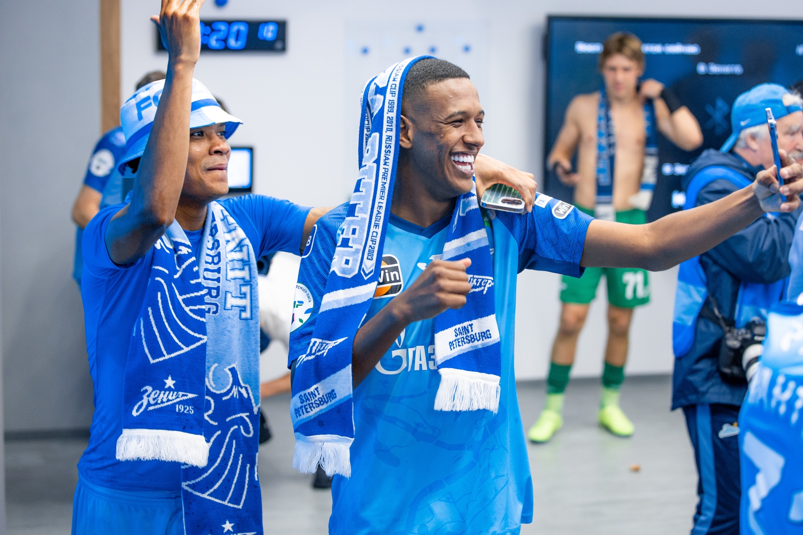 07.05.2023. Россия, Санкт-Петербург, «Газпром Арена». Команда в раздевалке празднует победу в Чемпионате России после матча Мир Российская Премьер-Лига 2022/23, 26-й тур, «Зенит» — «Спартак». На снимке: Вильмар Барриос, полузащитник ФК «Зенит», Роберт Ренан, защитник ФК «Зенит».Автор: Анна Мейер / ФК «Зенит»