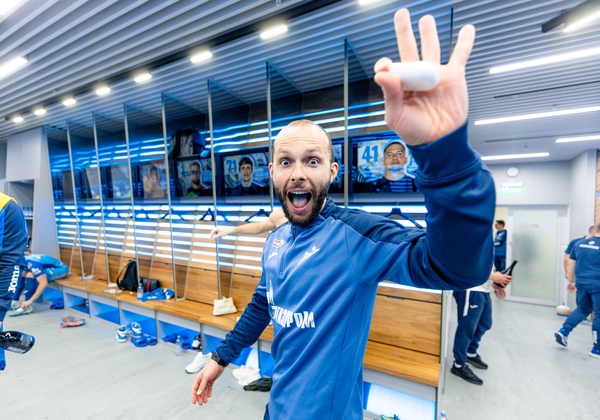 07.05.2023. Россия, Санкт-Петербург, «Газпром Арена». Команда в раздевалке празднует победу в Чемпионате России после матча Мир Российская Премьер-Лига 2022/23, 26-й тур, «Зенит» — «Спартак». На снимке: Михаил Кержаков, вратарь ФК «Зенит».Автор: Анна Мейер / ФК «Зенит»