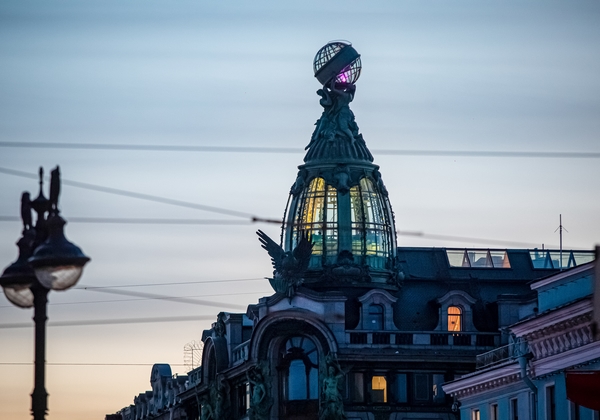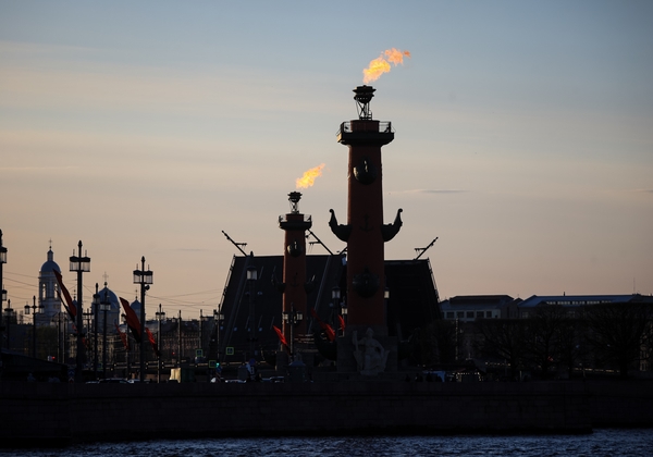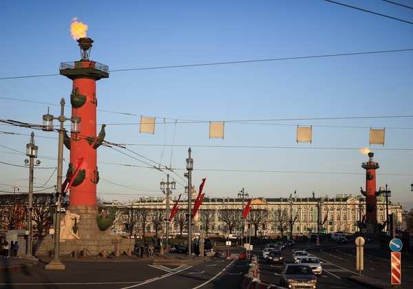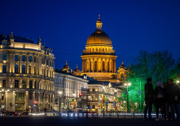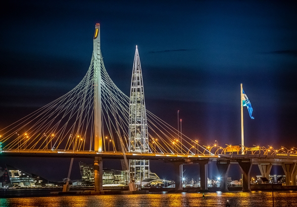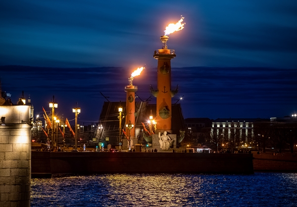 07.05.2023. Россия, Санкт-Петербург. Городские достопримечательности окрасились в цвета чемпионов.