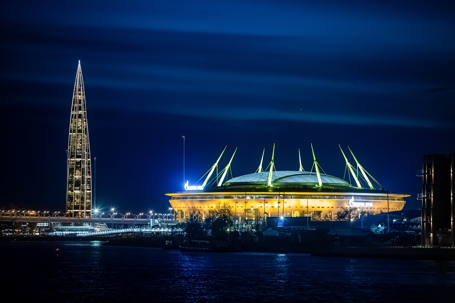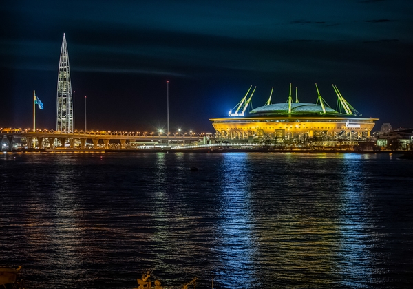 07.05.2023. Россия, Санкт-Петербург. Городские достопримечательности окрасились в цвета чемпионов. Золотая подсветка стадиона «Газпром Арена».
