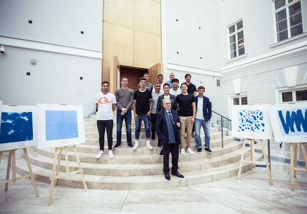 22.08.2019. Россия, Санкт-Петербург, Государственный Эрмитаж. Гавный тренер и футболисты сине-бело-голубых прибыли в здание Главного штаба, чтобы увидеть шедевр Малевича и создать собственные вариации на тему «Синий квадрат» в рамках благотворительной акции для центра «Антон тут рядом». На снимке: Магомед Оздоев, полузащитник ФК «Зенит», Михаил Кержаков, вратарь ФК «Зенит», Эмилиано Ригони, полузащитник ФК «Зенит», Эмануэль Маммана, защитник ФК «Зенит», Дуглас Сантос, защитник ФК «Зенит», Себастьян Дриусси, нападающий ФК «Зенит», Михаил Пиотровский, директор Государственного Эрмитажа, Игорь Смольников, защитник ФК «Зенит», Сердар Азмун, нападающий ФК «Зенит», Далер Кузяев, полузащитник ФК «Зенит», Александр Ерохин, полузащитник ФК «Зенит», Сергей Семак, главный тренер ФК «Зенит».Автор: Анна Мейер / ФК «Зенит»