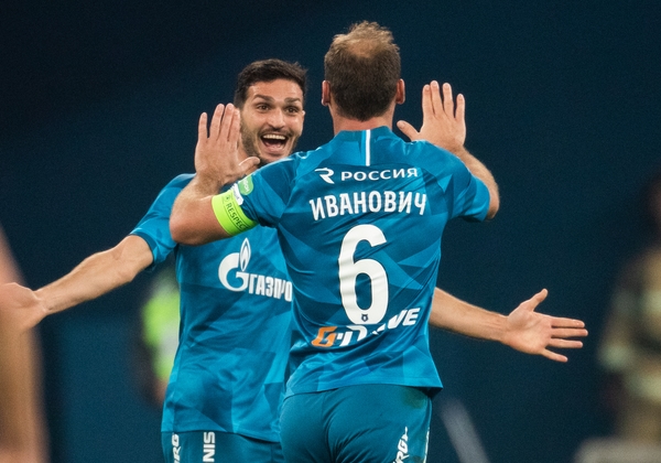 21.09.2019. Россия, Санкт-Петербург, «Газпром Арена». Российская Премьер-Лига 2019/20, 10-й тур, «Зенит» — «Рубин». На снимке в синей форме: Магомед Оздоев, полузащитник ФК «Зенит», Бранислав Иванович, защитник ФК «Зенит».Автор: Вячеслав Евдокимов / ФК «Зенит»