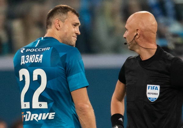 21.09.2019. Россия, Санкт-Петербург, «Газпром Арена». Российская Премьер-Лига 2019/20, 10-й тур, «Зенит» — «Рубин». На снимке в синей форме: Артём Дзюба, нападающий ФК «Зенит» и Сергей Карасев, главный главный судья матча.Автор: Вячеслав Евдокимов / ФК «Зенит»