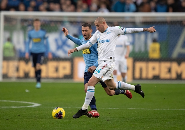 09.03.2020. Россия, Санкт-Петербург, «Газпром Арена». ТИНЬКОФФ Российская Премьер-Лига 2019/20, 21-й тур, «Зенит» — «Уфа». На снимке в синей форме: Юрий Жирков, защитник ФК «Зенит».Автор: Вячеслав Евдокимов / ФК «Зенит»