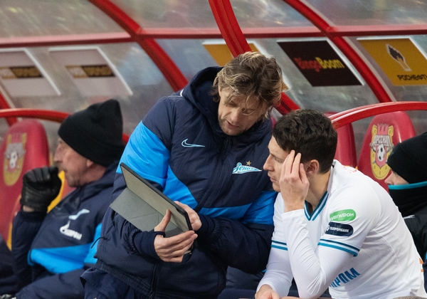 06.12.2019. Россия, Санкт-Петербург, «Газпром Арена». Российская Премьер-Лига 2019/20, 19-й тур, «Зенит» — «Динамо». На снимке: Евгений Кошелев, начальник команды ФК «Зенит», Вильям де Оливейра, тренер ФК «Зенит», и Сергей Семак, главный тренер ФК «Зенит».Автор: Вячеслав Евдокимов / ФК «Зенит»
