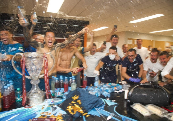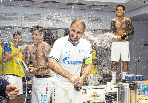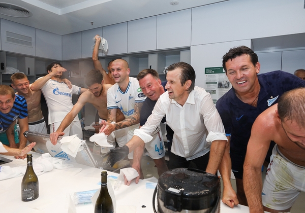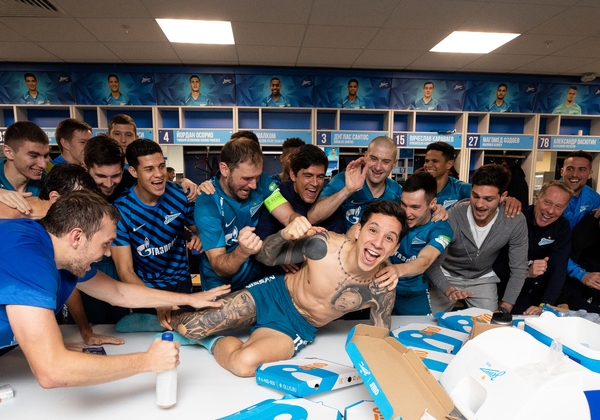 01.12.2019. Россия, Санкт-Петербург, «Газпром Арена». Команда празднует победу в раздевалке после матча Российская Премьер-Лига 2019/20, 18-й тур, «Зенит» — «Спартак».Автор: Вячеслав Евдокимов / ФК «Зенит»