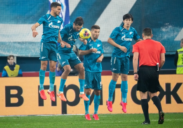19.10.2019, Россия, Санкт-Петербург, «Газпром Арена». Российская Премьер-Лига 2019/20, 13-тур, «Зенит» — «Ростов». На снимке в синей форме: Себастьян Дриусси, нападающий ФК «Зенит», Сердар Азмун, нападающий ФК «Зенит», Дуглас Сантос, защитник ФК «Зенит», Артём Дзюба, нападающий ФК «Зенит», Магомед Оздоев, полузащитник ФК «Зенит».Автор: Михаил Разуваев / ФК «Зенит»