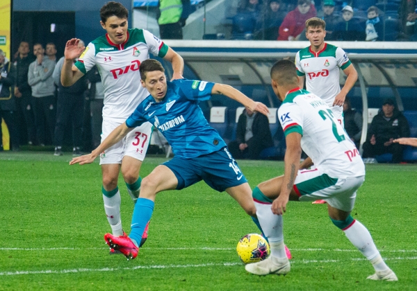 29.02.2020. Россия, Санкт-Петербург, «Газпром Арена». ТИНЬКОФФ Российская Премьер-Лига 2019/20, 20-й тур, «Зенит» — «Локомотив». На снимке в синей форме: Магомед Оздоев, полузащитник ФК «Зенит», Александр Ерохин, полузащитник ФК «Зенит», Алексей Сутормин, полузащитник ФК «Зенит», и Сердар Азмун, нападающий ФК «Зенит».Автор: Вячеслав Евдокимов / ФК «Зенит»