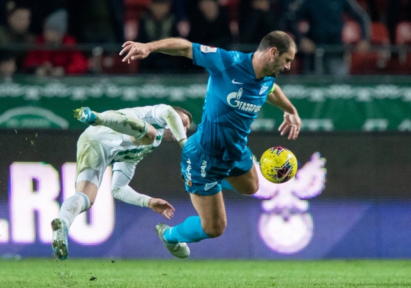 04.03.2020. Россия, Грозный, «Ахмат Арена». ОЛИМП — Кубок России 2019/20, 1/4 финала, «Ахмат» — «Зенит». На снимке в синей форме: Малком, полузащитник ФК «Зенит» и Эмилиано Ригони, полузащитник ФК «Зенит».Автор: Вячеслав Евдокимов / ФК «Зенит»
