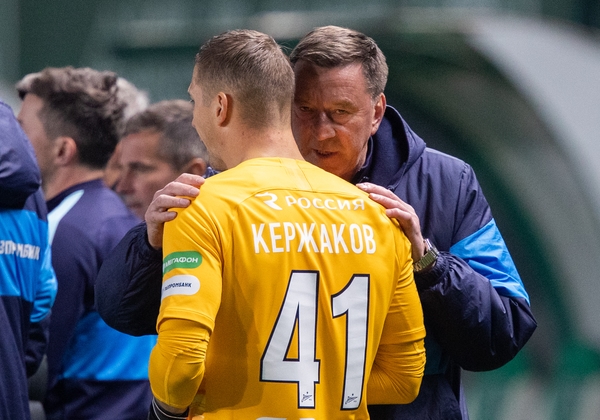04.03.2020. Россия, Грозный, «Ахмат Арена». ОЛИМП — Кубок России 2019/20, 1/4 финала, «Ахмат» — «Зенит». На снимке: Михаил Кержаков, вратарь ФК «Зенит» и Михаил Бирюков, тренер вратарей ФК «Зенит».Автор: Вячеслав Евдокимов / ФК «Зенит»
