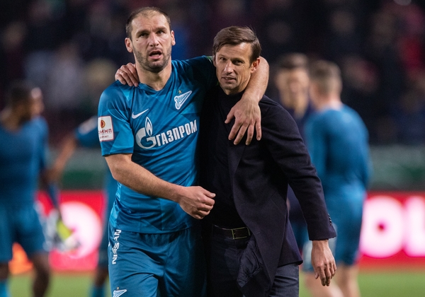 04.03.2020. Россия, Грозный, «Ахмат Арена». ОЛИМП — Кубок России 2019/20, 1/4 финала, «Ахмат» — «Зенит». На снимке: Бранислав Иванович, защитник ФК «Зенит», и Сергей Семак, главный тренер ФК «Зенит».Автор: Вячеслав Евдокимов / ФК «Зенит»