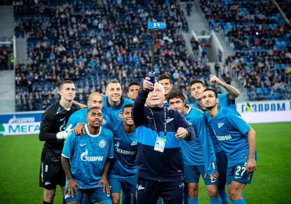 09.03.2020, Россия, Санкт-Петербург, «Газпром Арена». «Зенит» и компания Nike отметили юбилей с начала сотрудничества. Перед игрой против «Уфы» футболисты сине-бело-голубых вышли в игровых футболках за 10 лет. На снимке: (первый ряд): Малком, полузащитник ФК «Зенит», Вильмар Барриос, полузащитник ФК «Зенит», Вячеслав Караваев, защитник ФК «Зенит», Юрий Жирков, защитник ФК «Зенит», Магомед Оздоев, полузащитник ФК «Зенит», (второй ряд) Андрей Лунёв, вратарь ФК «Зенит», Ярослав Ракицкий, защитник ФК «Зенит», Артём Дзюба, нападающий ФК «Зенит», Дуглас Сантос, защитник ФК «Зенит», Йордан Осорио, защитник ФК «Зенит», Эмилиано Ригони, полузащитник ФК «Зенит» и Вячеслав Евдокимов, фотограф ФК «Зенит» (в центре).Автор: ФК «Зенит»