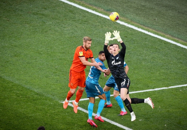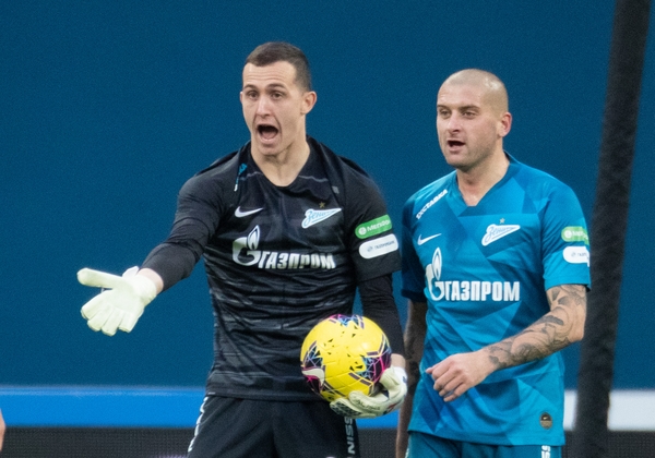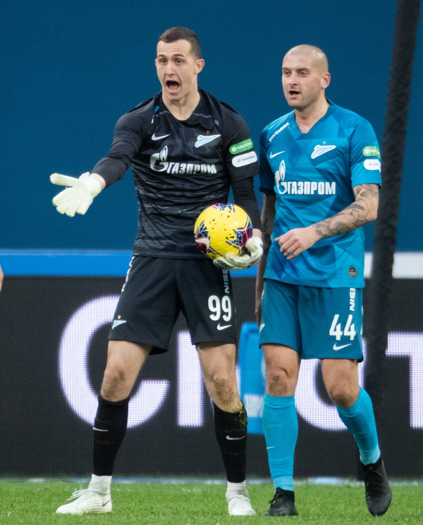 14.03.2020. Россия, Санкт-Петербург, «Газпром Арена». ТИНЬКОФФ Российская Премьер-Лига 2019/20, 22-й тур, «Зенит» — «Урал». На снимке: Андрей Лунёв, вратарь ФК «Зенит», и Ярослав Ракицкий, защитник ФК «Зенит».Автор: Вячеслав Евдокимов / ФК «Зенит»