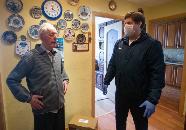 24.04.2020. Россия, Санкт-Петербург. Легендарный футболист сине-бело-голубых и тренер команды «Зенит»-2 Владислав Радимов (на снимке) доставил продуктовые наборы ветеранам «Зенита». На снимке: Дмитрий Николаевич Бесов, основатель и первый директор футбольной школы «Смена» и Владислав Владислав Радимов.Автор: Евгений Асмолов / ФК «Зенит»