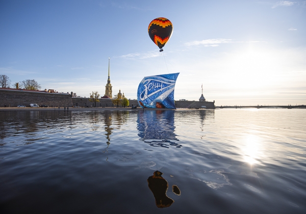 25.05.2020. Россия, Санкт-Петербург. Торжество 95-летия футбольного клуба «Зенит» в акватории Невы. После рассвета в 6 часов утра один из самых больших тепловых аэростатов в России (10 тыс. м3) поднял в небо над Петербургом конструкцию с полотном общей площадью 4 тыс. м2. На изготовление баннера у представителей фанатского движения ушло более 900 литров краски и две недели работы. Раннее утро был выбрано с учетом мер безопасности по нераспространению COVID-19 и во избежание массового скопление людей.Автор: Анна Мейер / ФК «Зенит»