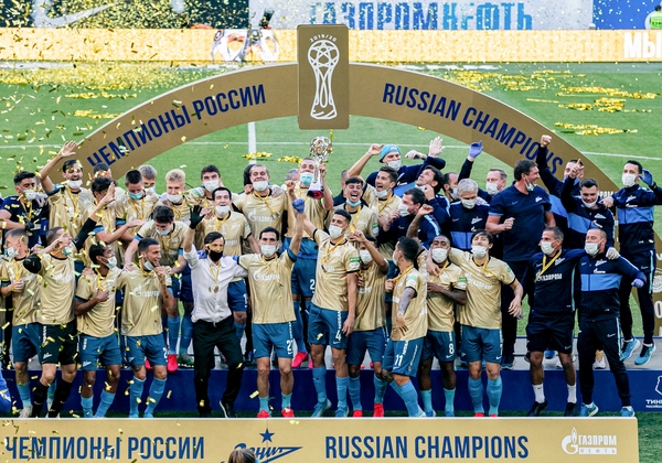 09.07.2020. Россия, Санкт-Петербург, «Газпром Арена». Тинькофф Российская Премьер-Лига 2019/20. Церемония награждения команды «Зенит» золотыми медалями и кубком чемпиона России.Автор: Евгений Васильев / ФК «Зенит»