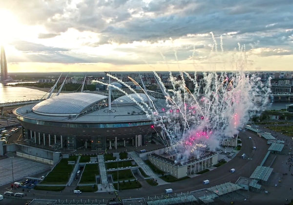 09.07.2020. Россия, Санкт-Петербург. Тинькофф Российская Премьер-Лига 2019/20. Салют с исторических павильонов «Газпром Арены» в честь завоевания «Зенитом» кубка чемпиона России сезона 2019/20.Автор: Матч ТВ / ФК «Зенит»