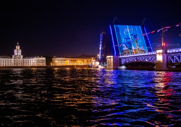27.07.2020. Россия, Санкт-Петербург. Свето-музыкальная инсталляция на Дворцовом мосту в честь золотого дубля «Зенита». В ночь на 27 июля петербуржцы и гости города увидели уникальное световое шоу на одном из пролетов разведенного Дворцового моста. Пролет, расположенный со стороны Зимнего дворца, превратился в гигантский экран площадью более 500 квадратных метров, на котором при помощи мощных проекторов были показаны самые важные и эмоциональные моменты уникального сезона. Сезона, в котором «Зенит» дважды доказал, что является самым сильным футбольным клубом России.Автор: Евгений Асмолов / ФК «Зенит»