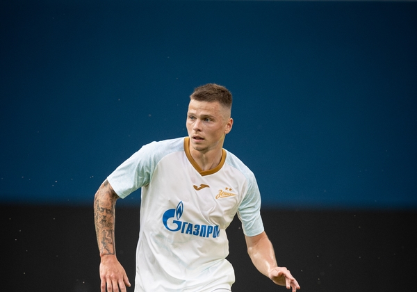 10.07.2023. Россия, Санкт-Петербург, «Газпром Арена». Товарищеский матч «Зенит» — «Динамо» СПб. На снимке в белой форме: Андрей Мостовой, полузащитник ФК «Зенит».Автор: Вячеслав Евдокимов / ФК «Зенит»