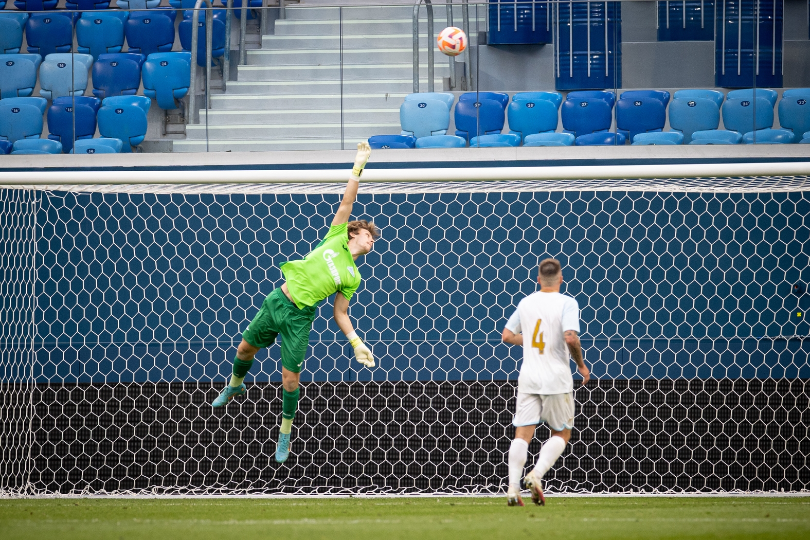10.07.2023. Россия, Санкт-Петербург, «Газпром Арена». Товарищеский матч «Зенит» — «Динамо» СПб. На снимке в зеленой форме: Никита Гойло, вратарь ФК «Зенит».Автор: Вячеслав Евдокимов / ФК «Зенит»