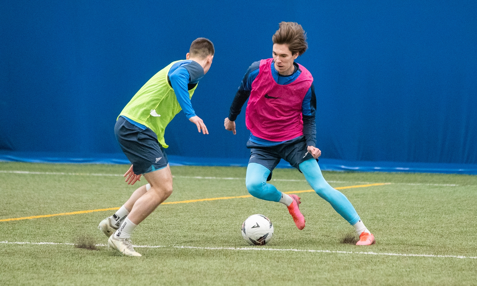 06.02.2024. Россия, Санкт-Петербург. Тренировка ФК «Зенит»-2 в «Газпром»-Академии. На снимке: Серафим Абзалилов, защитник ФК «Зенит», Алексей Барановский, нападающий ФК «Зенит».Автор: Евгений Асмолов / ФК «Зенит»