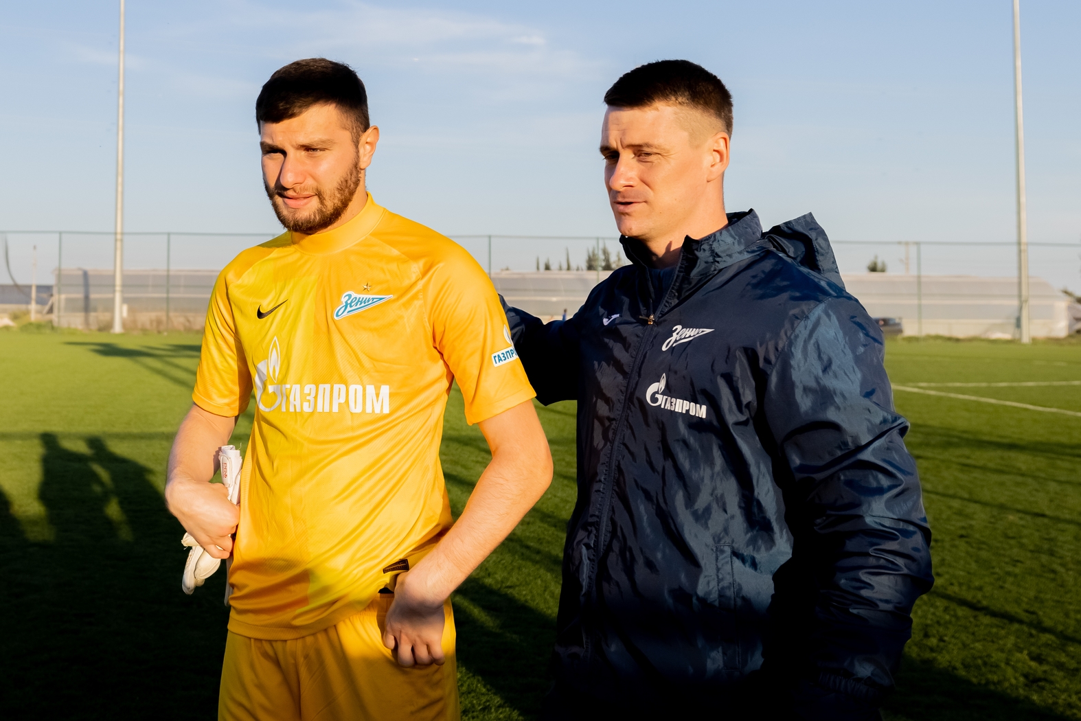 10.03.2024. Турция, Анталья. Второй зимний учебно-тренировочный сбор ФК «Зенит»-2 в Турции: товарищеский матч «Зенит»-2 — «Мурас Юнайтед» (Кыргызстан). На снимке: Давид Бязров , вратарь ФК «Зенит», и Евгений Понятовский, тренер вратарей ФК «Зенит».Автор: Евгений Васильев / ФК «Зенит»